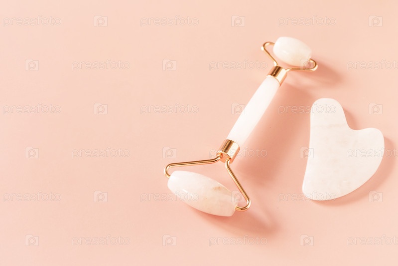 Ролик для массажа лица из розового кварца на розовом фоне. Массажные инструменты с нефритовым камнем, омолаживающий инструмент для ухода за кожей против морщин. Скопируйте пространство
