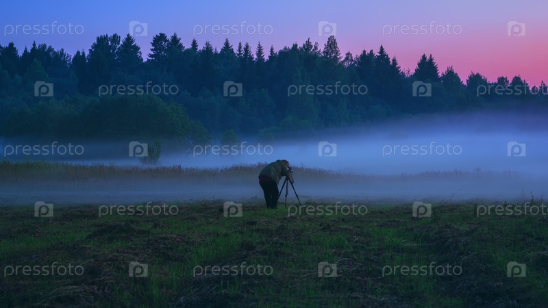 Фотограф со штативом снимает туман в сумерках