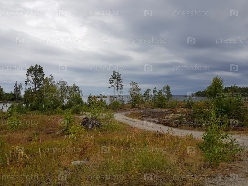 Пасмурный летний северный пейзаж под темным облачным небом перед проливным дождем. Грунтовая дорога среди деревьев и травы ведет через скалистый берег к Онежскому озеру