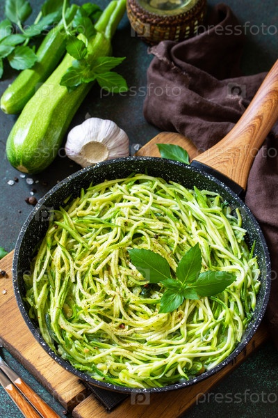 Здоровая веганская еда, блюдо с низким содержанием углеводов. Приготовленная лапша из цуккини с базиликом и чесноком в чугунной сковороде на каменной столешнице