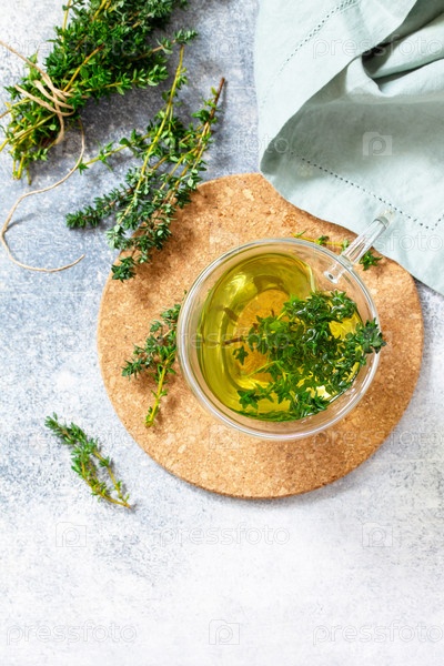 Лечебный травяной чай. Горячая чашка чая с тимьяном на светлой каменной столешнице. Плоская планировка, вид сверху. Свободное место для вашего текста