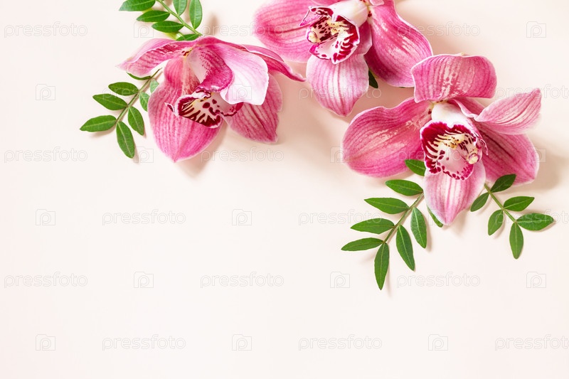 Цветочный фон с орхидеями, минимальная концепция. Тропические розовые орхидеи фаленопсис на светлом пастельном фоне. Цветочная композиция. Вид сверху, пространство для копирования