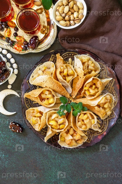 Арабская кухня. Рамадан Карим Праздничный. Меню Рамадана, арабский блин катаеф (катаев, катаеф) с яблочной начинкой и корицей. Скопируйте пространство. Плоская планировка, вид сверху