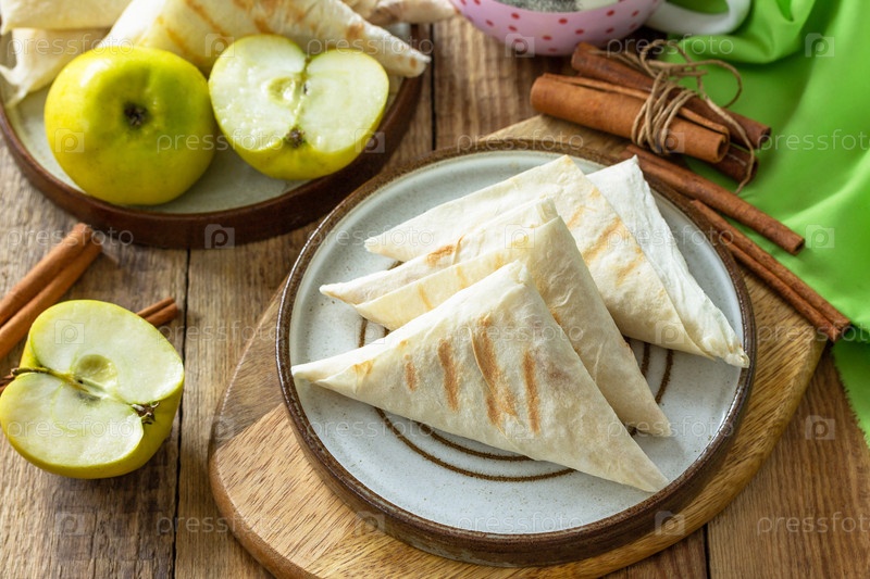 Яблочные булочки на завтрак. Жареный треугольник из лаваша с яблоками и корицей на деревянном деревянном столе