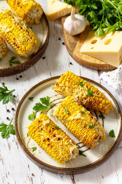 Летний ужин или закуски. Идея для барбекю или гриля. Мексиканская кукуруза на гриле с сыром на деревенском деревянном столе
