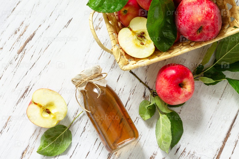Здоровая органическая пища. Яблочный уксус, бутылка яблочного уксуса на деревенском столе. Вид сверху на плоский фон