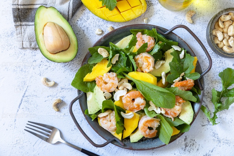 Здоровый диетический салат с рукколой, шпинатом, манго, авокадо, креветками, орехами пекан и соусом винегрет на серой каменной столешнице. Вид сверху на плоский фон