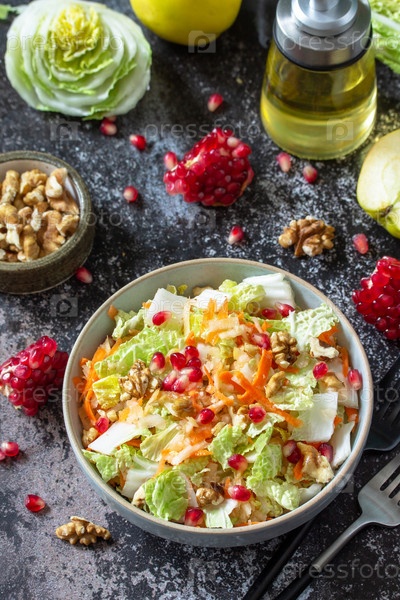 Осенний диетический салат из китайской капусты из свежих овощей, моркови, яблок, орехов и граната с соусом винегрет на темном каменном столе