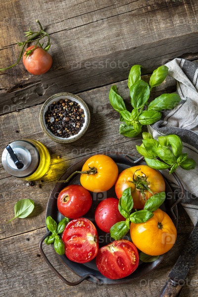 Свежие сырые спелые органические желтые, красные помидоры и ингредиенты для приготовления салата на деревянном столе. Вид сверху на плоский фон. Скопируйте пространство