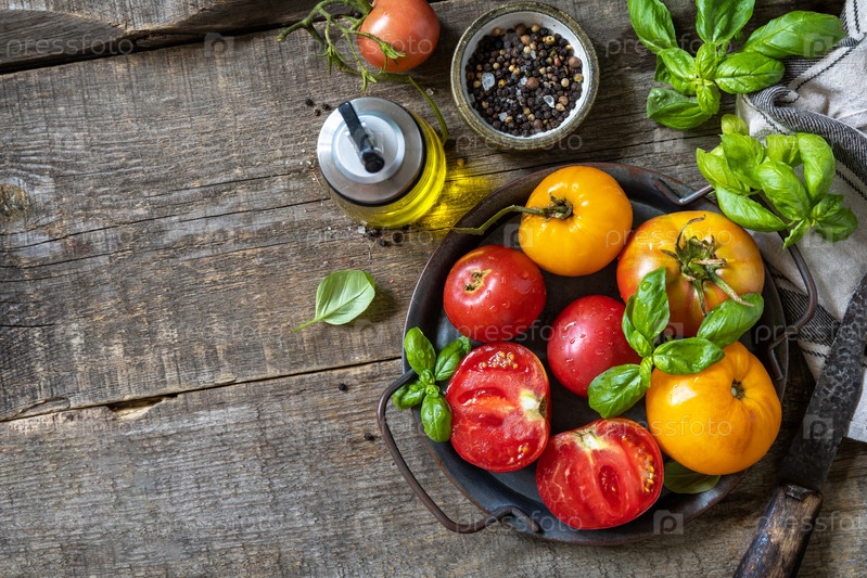 Свежие сырые спелые органические желтые, красные помидоры и ингредиенты для приготовления салата на деревянном столе. Вид сверху на плоский фон. Скопируйте пространство