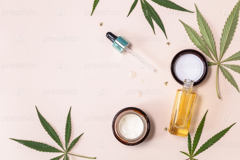 СПА органический косметический продукт. Концепция травяной альтернативной медицины. Косметический крем каннабиса, сыворотка для лица и листья конопли на бежевом фоне. Плоская планировка, вид сверху. Скопируйте пространство