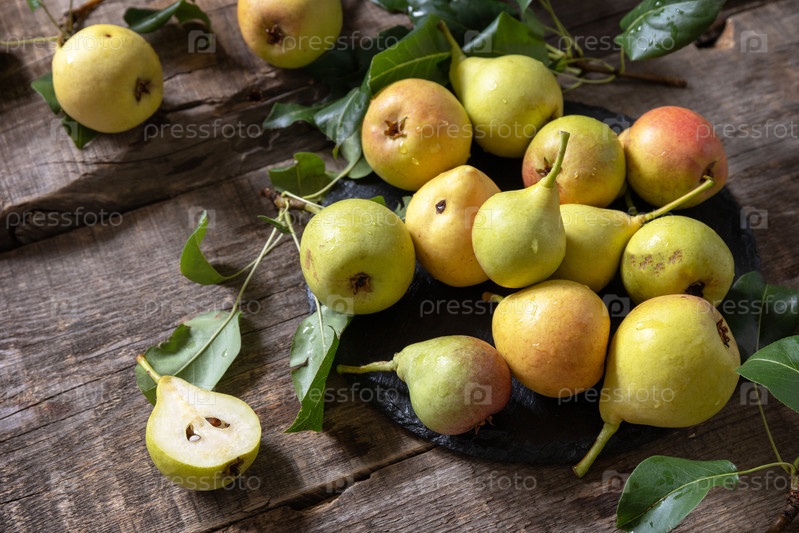 Органическая здоровая сочная спелая груша на деревянном кухонном столе. Концепция диетического меню и сбора фруктов