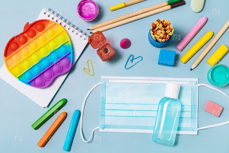 Школьные принадлежности, антистресс-поппит, маска для лица, бутылка дезинфицирующего средства для возвращения в школу на синем фоне