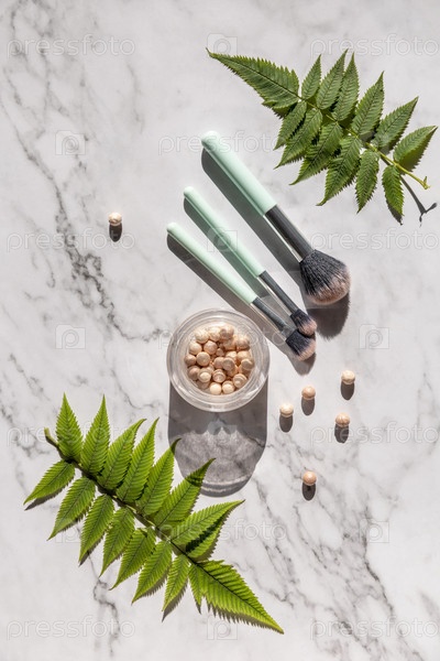 Плоский макияж. Декоративная косметика и кисти для макияжа на мраморной столешнице