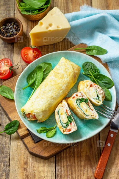 Японская кухня. Национальное японское блюдо Омлет тамаго яки на завтрак. Свернутое яйцо со шпинатом, помидорами и сыром на деревянном столе. Скопируйте пространство