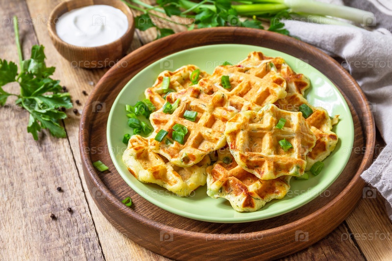 Несладкие вафли с картофелем, горошком, болгарским перцем, сыром подаются со сметаной и зеленью на тарелке на деревенском столе