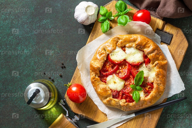 Полезная выпечка без глютена, из ржаной муки, диетическое питание. Помидоры галет, моцарелла и базилик на каменном фоне. Вид сверху, плоская планировка. Скопируйте пространство