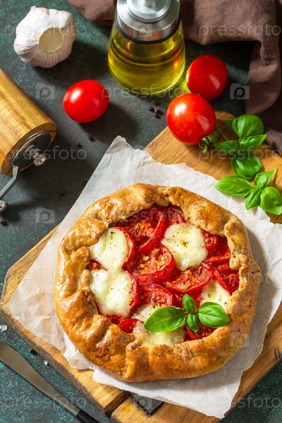 Полезная выпечка без глютена, из ржаной муки, диетическое питание. Помидоры галет, моцарелла и базилик на каменном фоне
