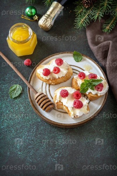 Рождественский ужин, праздничное меню. На праздничный рождественский стол подается традиционная итальянская закуска из брускетты антипасто со сливочным сыром, малиной и медом. Скопируйте пространство