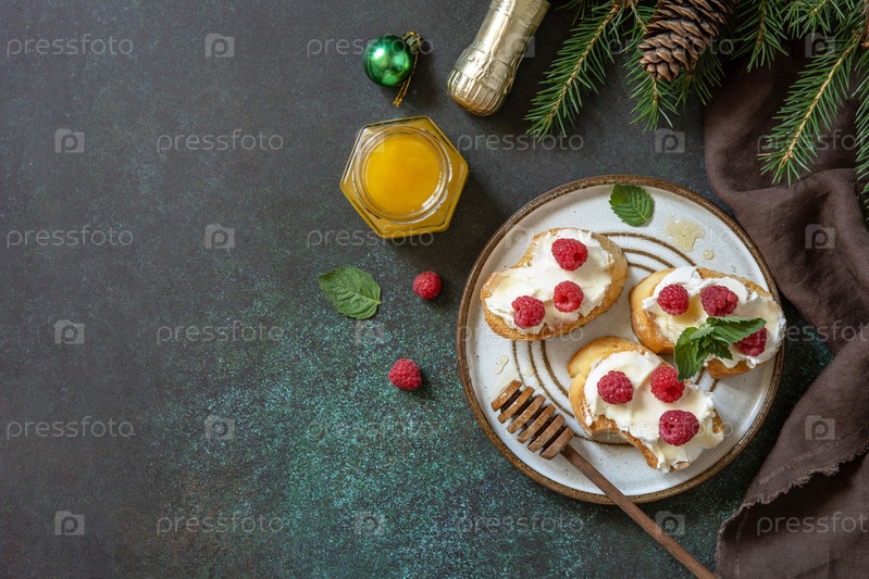 Рождественский ужин, праздничное меню. На праздничный рождественский стол подается традиционная итальянская закуска из брускетты антипасто со сливочным сыром, малиной и медом. Плоская планировка, вид сверху