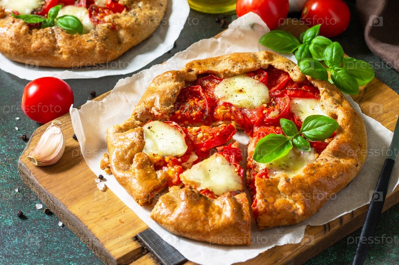 Полезная выпечка без глютена, из ржаной муки, диетическое питание. Помидоры галет, моцарелла и базилик на каменном фоне