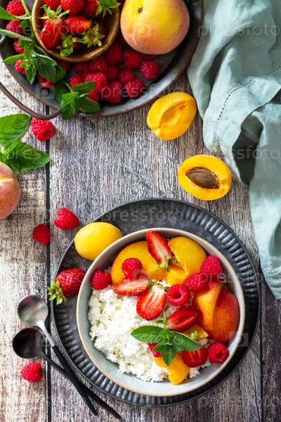 Деревенский летний завтрак или десерт. Творог или творог подаются со свежими летними фруктами и ягодами на деревянном столе. Плоская планировка, вид сверху