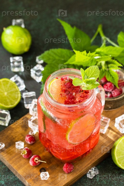 Летние напитки, бар безалкогольных напитков. Освежающие стаканы пьют малину с мятным лаймом и льдом на темном каменном столе