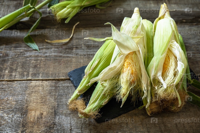 Здоровая спелая кукуруза на деревянном кухонном столе. Концепция органического меню и осенняя заготовка овощей. Скопируйте пространство