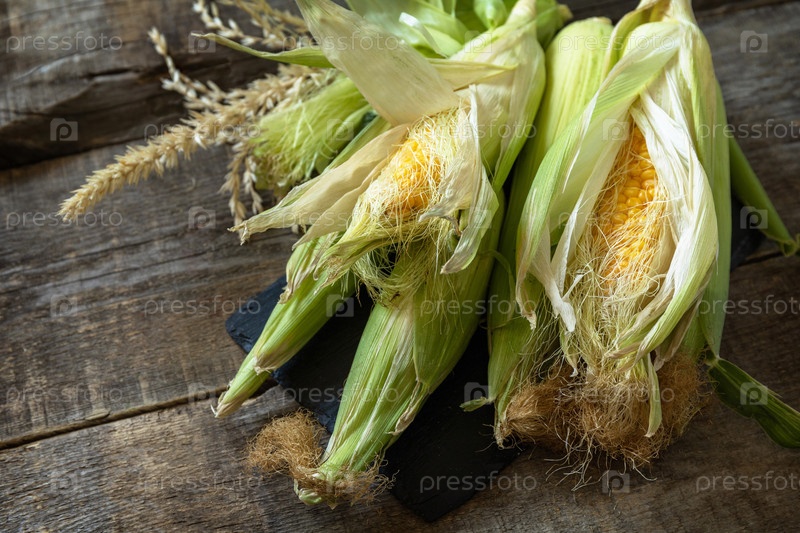 Здоровая спелая кукуруза на деревянном кухонном столе. Концепция органического меню и осенняя заготовка овощей