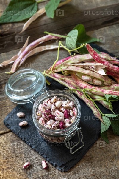 Фасоль из фасоли, коричневая фасоль (из сушеных бобов) в стеклянной банке на деревенском столе. Продовольственный фон