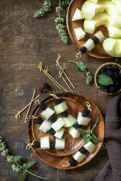 Праздничная закуска из фруктово-ягодных канапе. Еда для Хэллоуина. Канапе с дыней и ежевикой на деревянном столе. Вид сверху на плоский фон. Скопируйте пространство