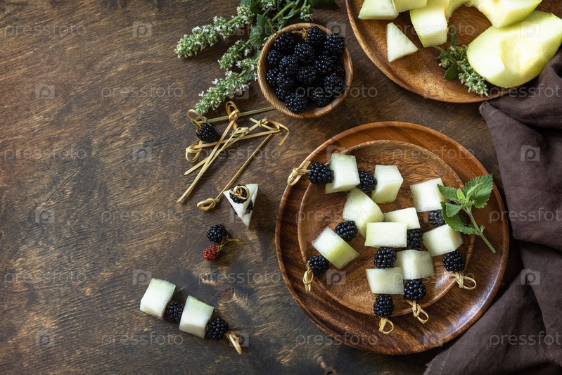 Праздничная закуска из фруктово-ягодных канапе. Еда для Хэллоуина. Канапе с дыней и ежевикой на деревянном столе. Вид сверху на плоский фон. Скопируйте пространство