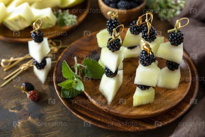 Праздничная закуска из фруктово-ягодных канапе. Еда для Хэллоуина. Канапе с дыней и ежевикой на деревянном столе