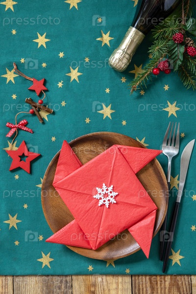Сервировка стола для рождественского ужина, праздничная композиция. Столовая вилка и нож с красной бумажной салфеткой и еловой веткой на деревенском праздничном столе. Вид сверху на плоский фон