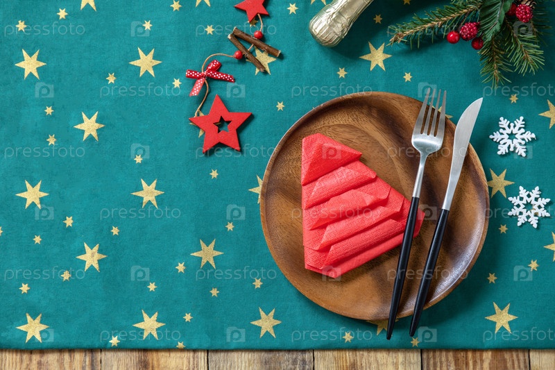 Сервировка стола для рождественского ужина, праздничная композиция. Столовая вилка и нож с красной бумажной салфеткой и еловой веткой на деревенском праздничном столе. Вид сверху на плоский фон. Скопируйте пространство