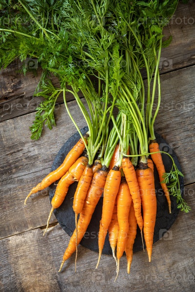 Здоровая спелая сочная морковь на деревянном кухонном столе. Концепция органического питания и осеннего сбора овощей. Вид сверху на плоский фон