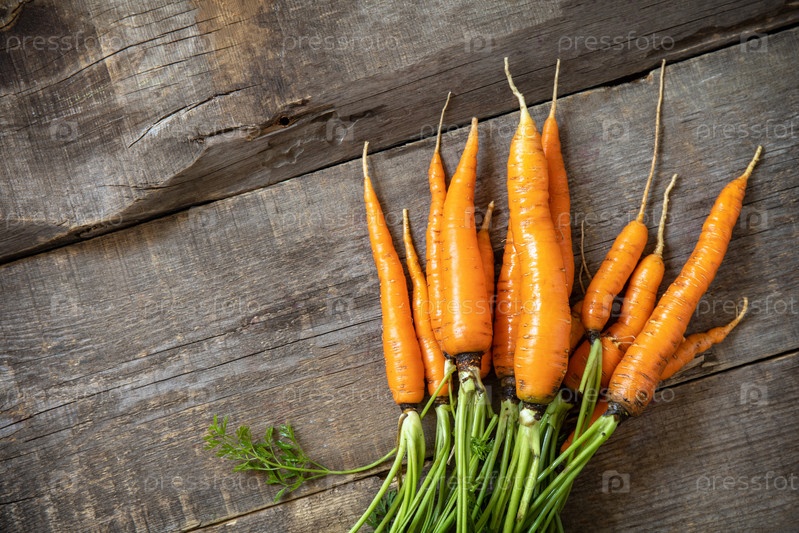 Здоровая спелая сочная морковь на деревянном кухонном столе. Концепция органического питания и осеннего сбора овощей. Вид сверху на плоский фон. Скопируйте пространство