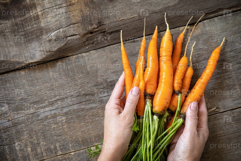 Женские руки держат спелую сочную морковь над деревянным кухонным столом. Концепция органического питания и осеннего сбора овощей. Вид сверху на плоский фон. Скопируйте пространство