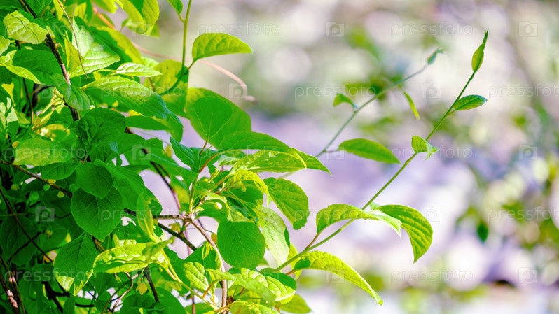 Нежно зеленая листва китайской лимонной лианы с листьями весной