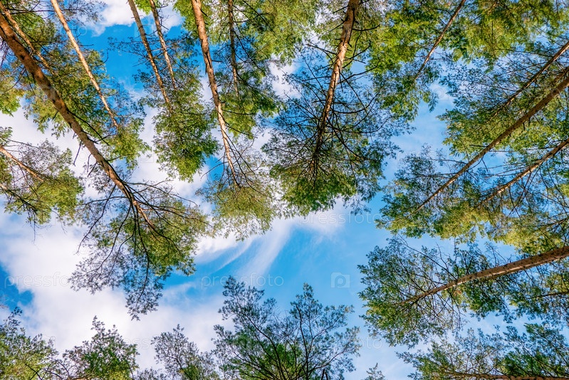 Посмотрите на небо в сосновом лесу. Зеленые вершины сосен на фоне голубого неба с облаками