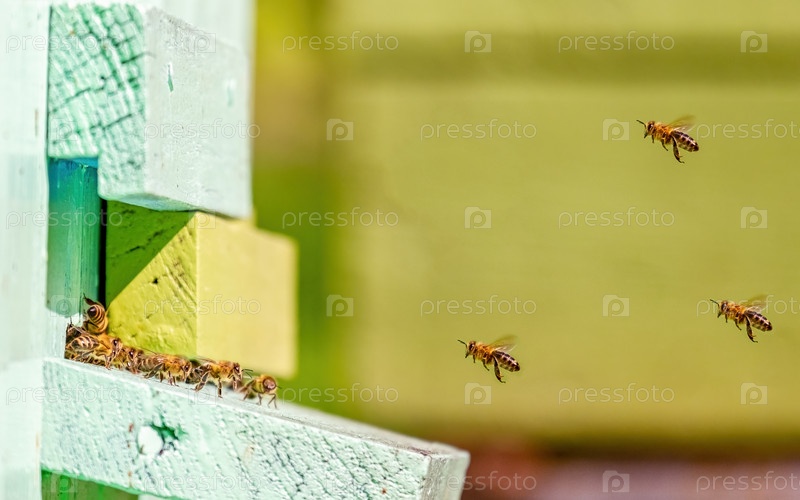Пчелы влетают и вылетают из улья. Крупный план. Солнечный день
