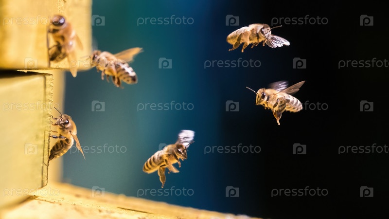 Группа пчел возле улья в полете