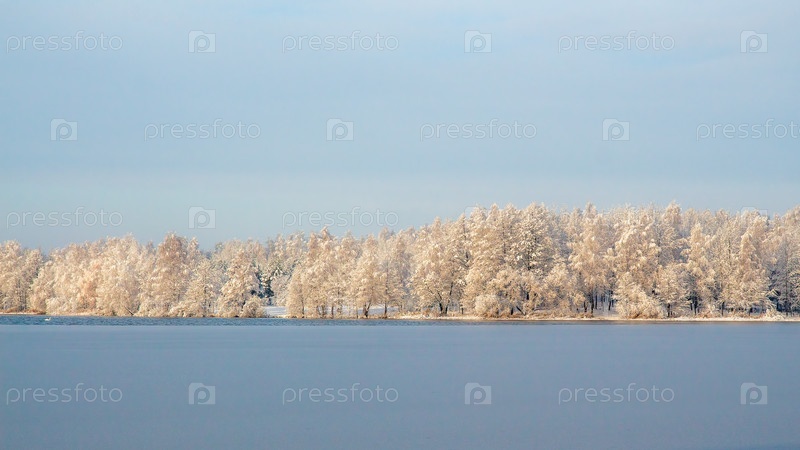 Заснеженные деревья, покрытые инеем, на берегу озера зимой