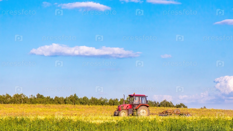Красный трактор пашет поле в летний день. Рабочий день в сельском хозяйстве