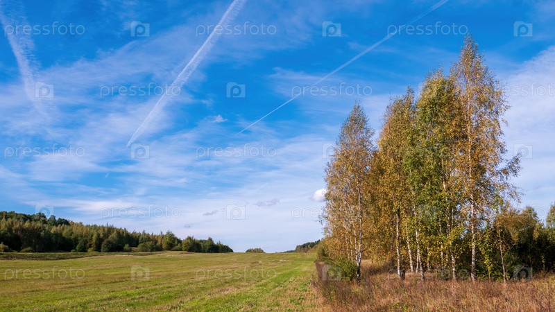 Яркий пейзаж ранней осенью. Насыщенное голубое небо над пастбищем