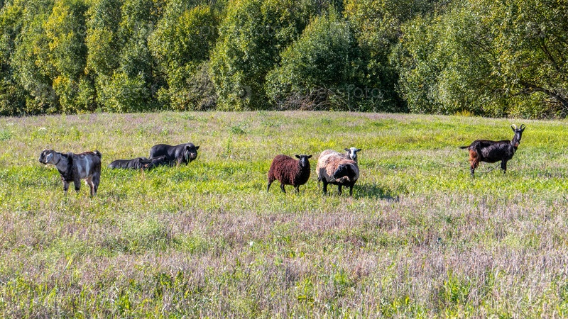 Овцы, козы, черные свиньи на лугу на пастбище. Банда