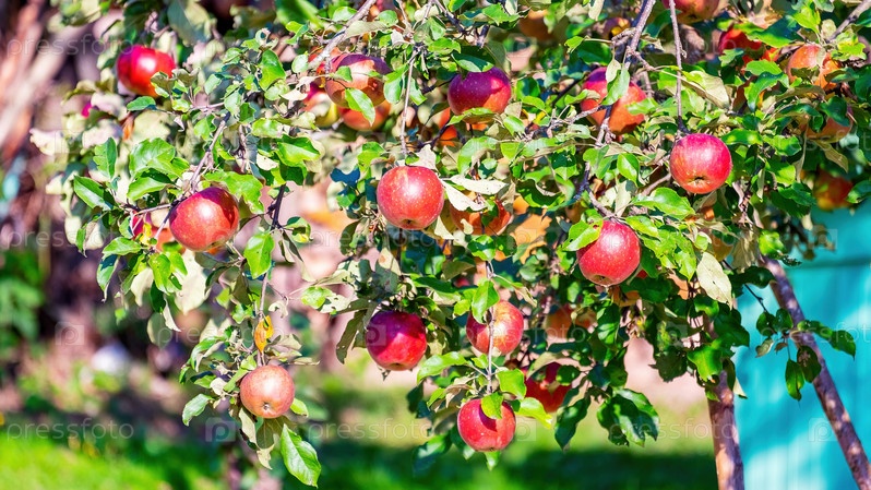 Красные яблоки на ветке яблони. Урожай. Мягкое солнце