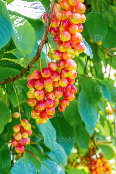 Китайский лимонник (Schisandraceae). букеты созревающих ягод на виноградной лозе куста