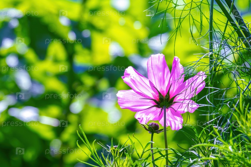 Космея (Космос). Розовый цветок космеи (семейство подсолнечника) под солнечными лучами