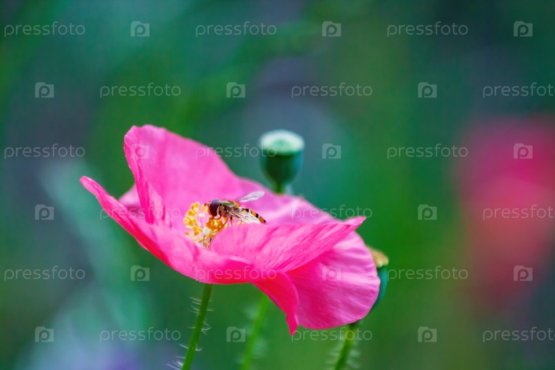 Летящая муха (Syrphidae) на цвете мак, собирающая нектар